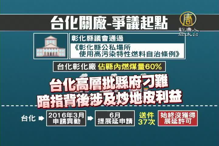【新唐人亞太台 2016 年 10 月 07 日訊】彰化縣政府為維護空氣品質,與都市計畫完整性,駁回台化彰化廠,汽電共生設備操作許可證展延申請,引發台化員工抗爭,認為縣府刁難,質疑背後是否有其他原因。我們用一分鐘帶您了解,台化案的關廠爭議。