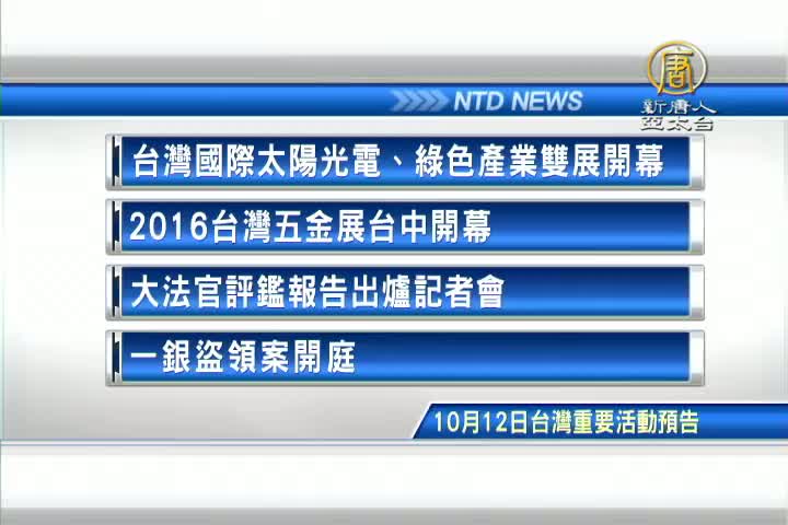 【新唐人亞太台 2016 年 10 月 12 日訊】接著看到,今天,10月12日,星期三,有哪些重要活動。首先是,台灣國際太陽光電、綠色產業雙展在台北南港展覽館開幕;而在台中,也有2016台灣五金展開幕,另外是,民間監督大法官人選聯盟舉辦大法官評鑑報告出爐記者會;最後是史上最大宗的一銀盜領案,下午開庭。
