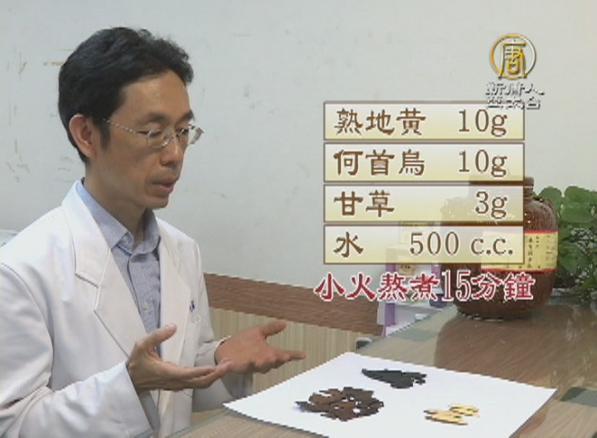 中醫師 吳國斌:「何首烏呢,它有補養肝腎的效果,所以它也養血益肝,固精益腎,健筋骨,烏髭髮(鬢髮),(喝)3到6個月,慢慢的你可以感覺到你的頭髮可以烏黑亮麗起來。」