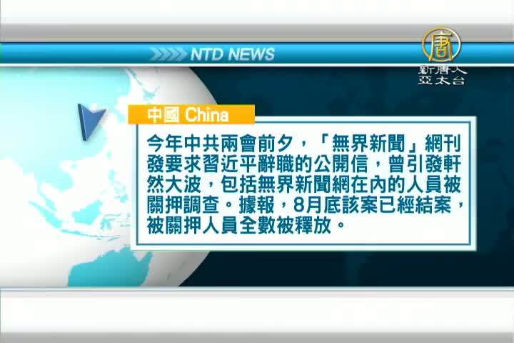 今年中共兩會前夕,「無界新聞」網刊發要求習近平辭職的公開信,曾引發軒然大波,包括無界新聞網在內的人員被關押調查。據報,8月底該案已經結案,被關押人員全數被釋放。