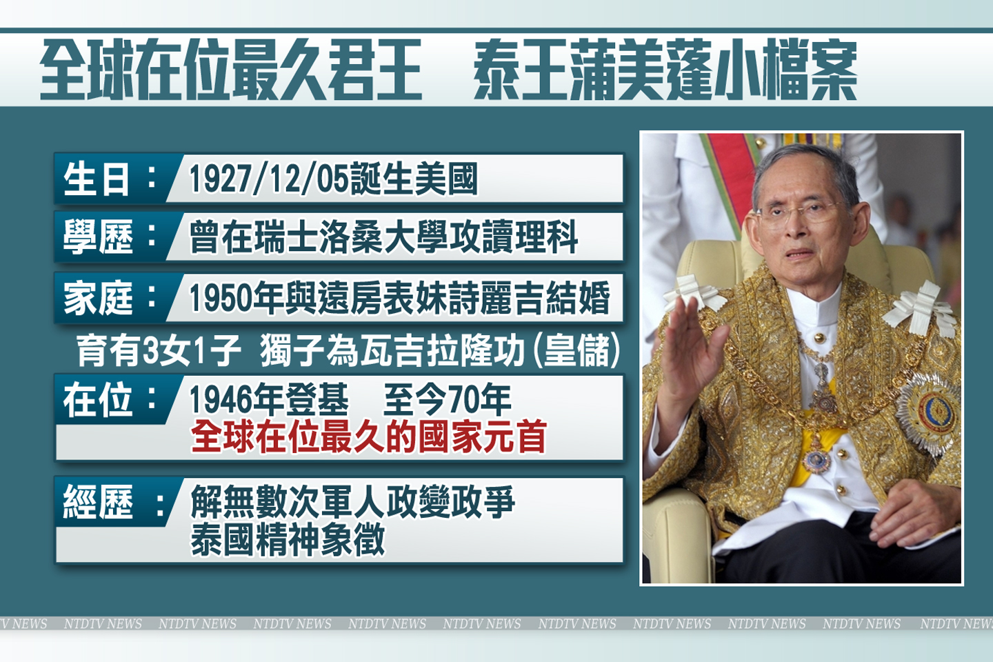 【新唐人亞太台 2016 年 10 月 13 日訊】新聞頭條先帶您關心,全球在位最久的國家元首,高齡八十八歲的泰皇蒲美蓬,病況引起全球關注。泰國政府在今天台北時間晚上八點對外說明,宣布泰皇病重辭世。泰王蒲美蓬1927年出生於美國,曾在瑞士洛桑大學就讀,結婚後育有3女1子,獨子是目前的皇儲,瓦吉拉隆功。而泰皇在位70年,調解過無數次軍人政變政爭、是泰國精神象徵。目前泰國軍政府領導人帕拉育,已經取消預定行程,趕回曼谷會見皇儲 。昨天,泰國股市一度大跌達6.8%,泰銖匯率也大貶1.1%。