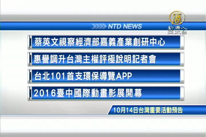 【新唐人亞太台 2016 年 10 月 14 日訊】接著看到,今天,10月14日,星期五,有哪些重要活動。首先是,總統蔡英文視察「經濟部嘉義產業創新研發中心」;再來是,國際信評機構惠譽 調升台灣主權評極說明會;台北101將推出首支環保導覽APP;以及,2016臺中國際動畫影展開幕。