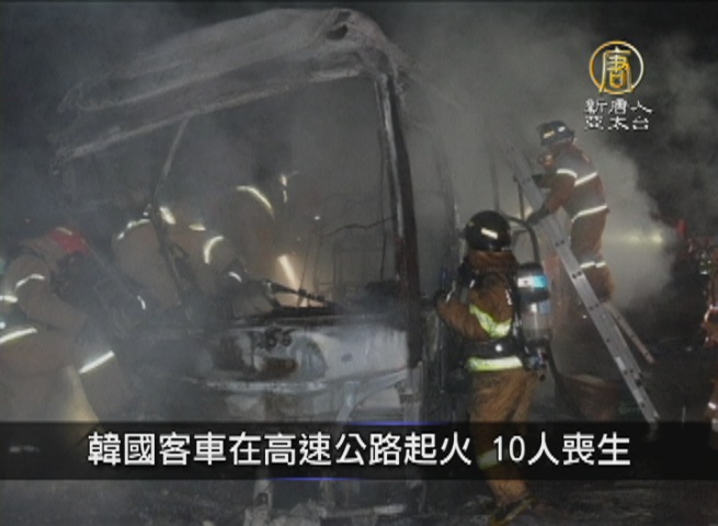 南韓京釜高速公路昨晚發生遊覽車火燒車事故,造成10人死亡、10人受傷,車上乘客多為韓華化學公司的退休員工,他們剛從中國旅遊回來。搭乘輛遊覽車從大邱機場返回蔚山。警方初步研判,遊覽車是爆胎後撞上護欄而起火。
