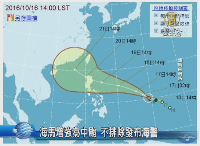 【新唐人亞太台 2016 年 10 月 16 日訊】新聞頭條先帶您關心,海馬颱風在今天下午增強為中度颱風,氣象局說,下星期四、星期五是颱風最接近台灣的時候,不排除發布海上颱風警報。多家機構認為海馬颱風將直接撲向中國東南沿岸,接下來海馬在南海 北轉的時間與角度,將關係到對台灣天氣影響大小。