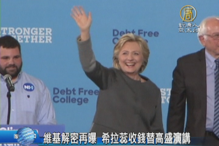 【新唐人亞太台 2016 年 10 月 17 日訊】關心美國大選,維基解密網站前天又釋出一批希拉蕊競選團隊被駭的電子郵件,其中包括在華爾街巨擘高盛公司的3場收費演講稿,顯示希拉蕊私下對待華爾街沒有她公開競選時那樣強硬。這些內容也如同黨內初選時,對手桑德斯所憂慮,她與華爾街關係太近,可能無法強硬整頓金融圈。