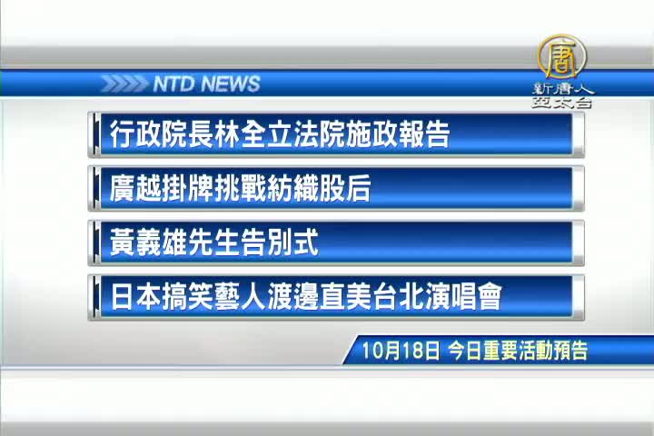 【新唐人亞太台 2016 年 10 月 18 日訊】接著看到,今天,10月18日,星期二,有哪些重要活動。首先是,行政院長林全立法院施政報告。財經消息,全球第2大羽絨衣代工廠,廣越今天掛牌,挑戰紡織股后。接著是,已故知名綜藝製作人黃義雄,今天將在台北舉行告別式,包括,江蕙、張小燕、張菲等重量級藝人都會到場 。最後是,日本搞笑藝人渡邊直美,今天將在台北舉行演唱會。