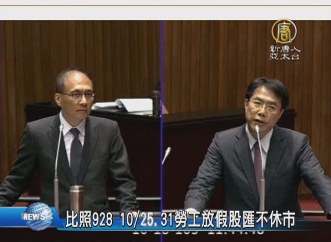 【新唐人亞太台 2016 年 10 月 18 日訊】再來關心,「一例一休」還沒通過修法,今年10月25日光復節,和10月31日的蔣公誕辰紀念日,勞工朋友都能再放2天國定假日。行政院長林全今天在立法院接受立委質詢時表示,由於勞基法修法趕不及在10月底前通過,因此這兩天假,政府機關照常運轉,股匯市也不會休市