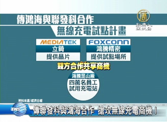 鴻海與聯發科傳出合作無線充電試點計畫,由聯發科旗下立錡提供晶片,而鴻海旗下鴻騰精密提供試點場所,試點方式,將導入鴻騰昆山廠,讓四萬名員工試用充電站,未來聯發科提供晶片,鴻海負責生產,雙方合作,共享商機。