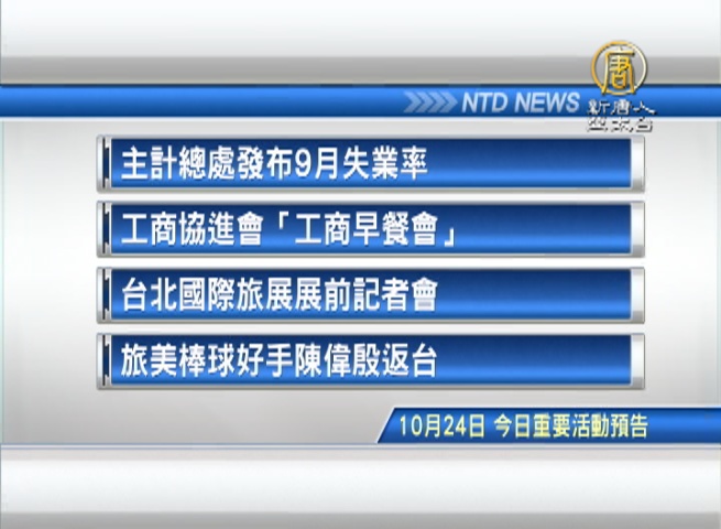 【新唐人亞太台 2016 年 10 月 24 日訊】接著看到,今天,10月24日,星期一,有哪些重要活動。首先是,主計總處發布9月失業率。再來是,工商協進會舉辦「工商早餐會」。最後是體壇消息,旅美棒球好手陳偉殷今天凌晨返台,下午將會在台北舉行記者會。