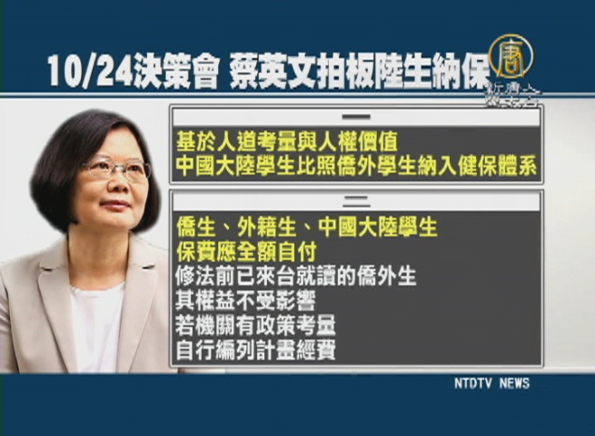 【新唐人亞太台 2016 年 10 月 25 日訊】總統蔡英文昨天(24日)主持執政決策協調會議,拍板陸生比照僑外生納入健保,但保費應全額自付,此舉也被解讀為,蔡英文對中國大陸釋出善意,朝野立委更是難得一致認可,就等後續修法通過,不過,之前強力杯葛陸生納保台聯黨,儘管沒有立委席次,仍跳出來開記者會批評。