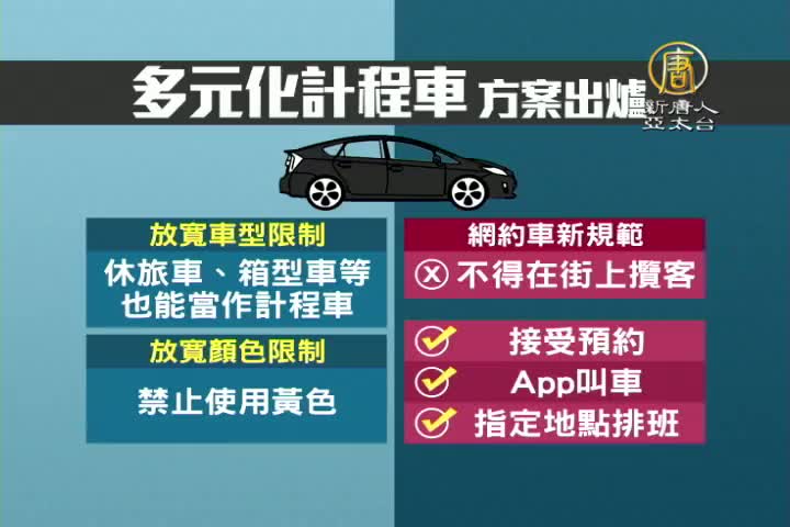 【新唐人亞太台 2016 年 10 月 25 日訊】交通部推動「多元化計程車方案」上路,今天開始,國內業者就能準備申請並規劃企劃書提案,而為了跟一般小黃有所區隔,車身不限顏色、休旅車也能當計程車,價格則「回歸市場機制」,除設定上下限,其他開放業者自訂。