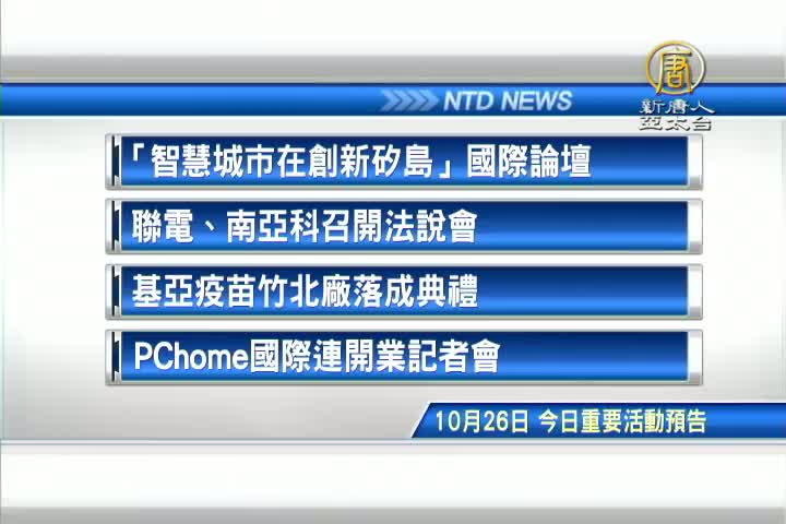 【新唐人亞太台 2016 年 10 月 26 日訊】接著看到,今天,10月26日,星期三,有哪些重要活動。首先是,「智慧城市在創新矽島」國際論壇;台灣電路板國際展覽會開幕;再來是,台灣首家由民間主導投資並設立的基亞疫苗竹北廠落成典禮;另外,PChome國際連正式加入第三方支付戰場,舉行開業記者會。