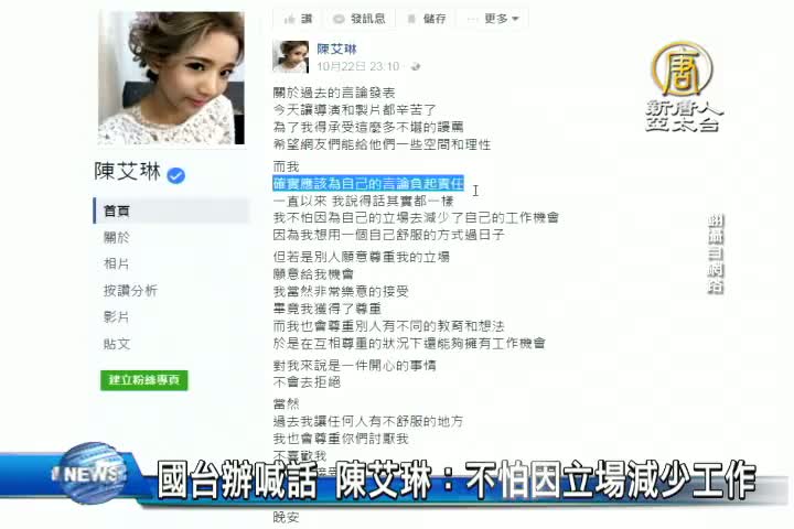 【新唐人亞太台 2016 年 10 月 26 日訊】繼周子瑜,與戴立忍之後,又一位台灣藝人遭中共霸凌,陳艾琳過去因為聲援太陽花學運及發表「我是台灣人」等言論,遭中共抵制,日前在中國完成的新片,也慘遭劇組換角,今天國台辦又拋出「反台獨」的言論,但陳艾琳說,不怕因為立場,減少工作。