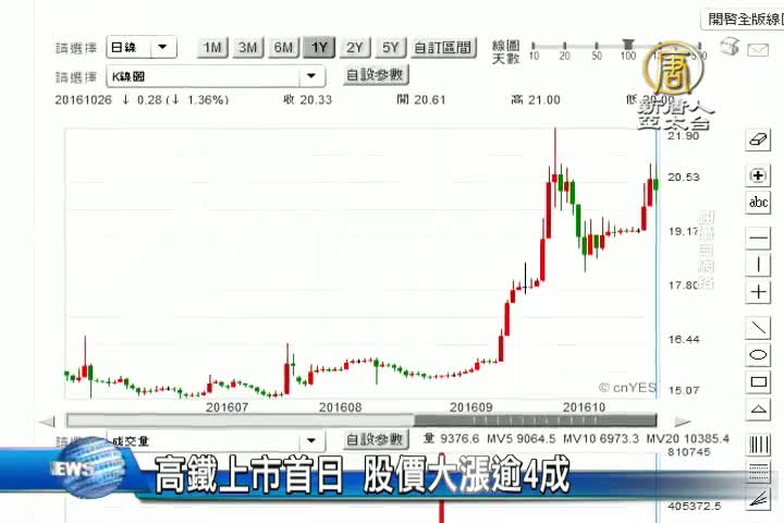 【新唐人亞太台 2016 年 10 月 27 日訊】台灣高鐵股票今天掛牌上市,上市價訂為台幣15.13元,9點開盤,股價便衝上20.6元,早盤最高價一度攻至21.6元,上市前10分鐘,成交量超過1萬5000張。高鐵是第一家上市的軌道運輸業者,目前資本額為260億元,今年資本市場最大的規模的上市案,今天也順利上演蜜月行情。