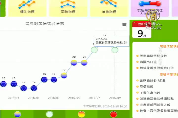 【新唐人亞太台 2016 年 10 月 27 日訊】再來看到,國發會今天公布9月景氣燈號,亮出連續第三顆綠燈,綜合判斷分數,比上個月減少2分到23分,不過,景氣領先、同時指標都呈現上升走勢,國發會認為,國內景氣持續回溫。