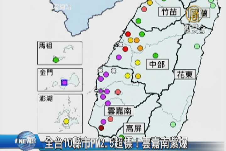 【新唐人亞太台 2016 年 10 月 28 日訊】鏡頭轉回台灣,觀眾朋友有沒有覺得今天天空特別灰濛濛的嗎?今天 台灣西半部地區受到大氣擴散不良影響,空氣品質相當糟糕, 有10個縣市PM2.5濃度偏高,包括新北市、桃園市、苗栗縣、台中市等地,而雲嘉南與外島金門等9個測站上午10點PM2.5更是達到紫爆等級,提醒觀眾民眾出門不妨佩戴口罩,敏感族群也要減少在戶外劇烈活動。