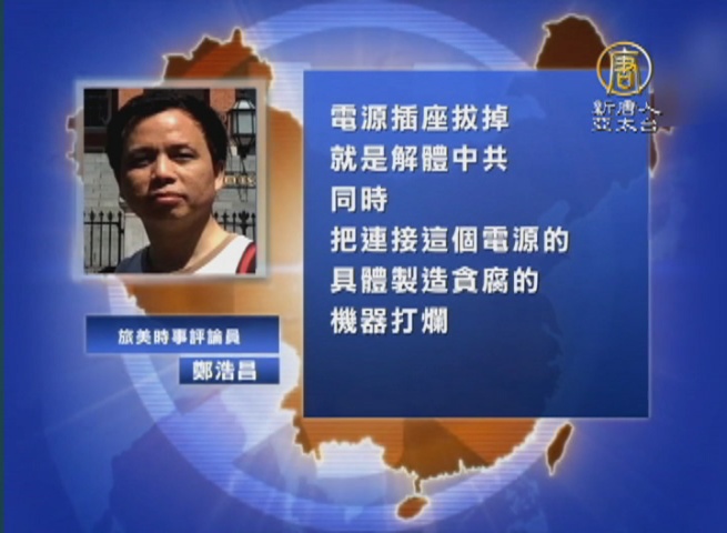 旅美時事評論員 鄭浩昌:「目前共產黨的問題加上江的政策,已經形成了一個十分巨大的腐敗的場,如果僅僅把場的一部分去掉,這個場會自動填補,產生新的貪官。所以呢,對習近平和王岐山而言,出路只有一個,就是把這個場的電源插座拔掉,就是解體中共,同時把連接這個電源的具體製造貪腐的機器打爛,也就是清算江澤民的政策。」