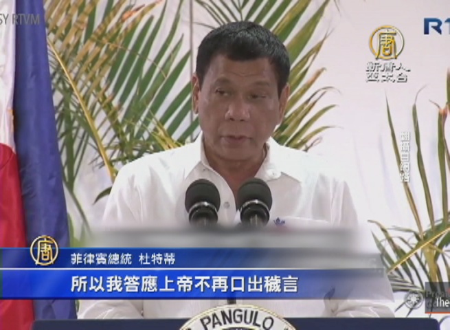 【新唐人亞太台 2016 年 10 月 28 日訊】菲律賓總統杜特蒂 今天公開表示,昨晚在從日本回國的飛機上,聽到了上帝的聲音。而且他還向「上帝」保證,以後不再口出穢言。