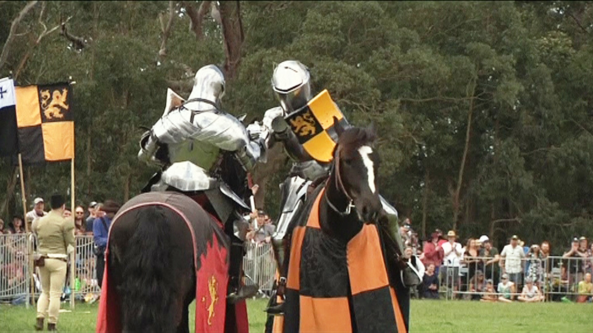 【新唐人亞太台 2016 年 10 月 28 日訊】以中古世紀為時空背景的西洋電影中,常會出現英姿煥發的武士帥氣的騎在馬背上,以長矛和敵人對決的畫面。最近在澳洲就舉辦了一場像這樣的馬上長矛的比武,非常驚險刺激,讓我們到現場看一看。