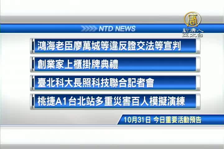 【新唐人亞太台 2016 年 10 月 31 日訊】接著看到,今天,10月31日,星期一,有哪些重要活動。首先是,鴻海老臣廖萬城等人違反證交法宣判。財經消息,創業家上櫃掛牌典禮。臺北科大長照科技聯合記者會。另外,今天桃捷A1台北站,有一場多重災害百人模擬演練。