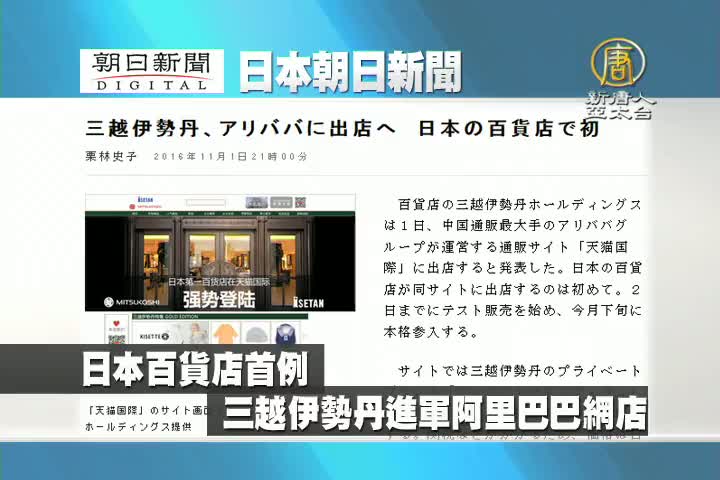【新唐人亞太台 2016 年 11 月 02 日訊】來看到日本朝日新聞報導:三越伊勢丹進軍阿里巴巴旗下的天貓國際,成為首家登錄阿里巴巴網路店鋪的日本百貨公司。