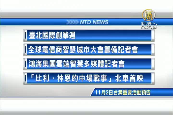 【新唐人亞太台 2016 年 11 月 02 日訊】接著看到,今天,11月2日,星期三,有哪些重要活動。首先是,臺北國際創業週。接著是,全球電信商智慧城市大會籌備記者會 。以及,鴻海集團雲端智慧多媒體記者會 。最後是娛樂消息, 大導演李安新片今天在台北車站舉行首映典禮