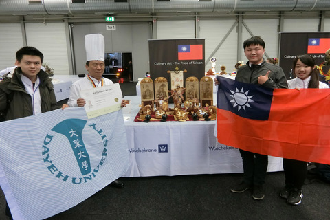 大葉大學餐旅系陳文正老師(左二)的「三國之馬超」,獲德國IKA奧林匹克廚藝挑戰賽金牌(大葉大學提供)