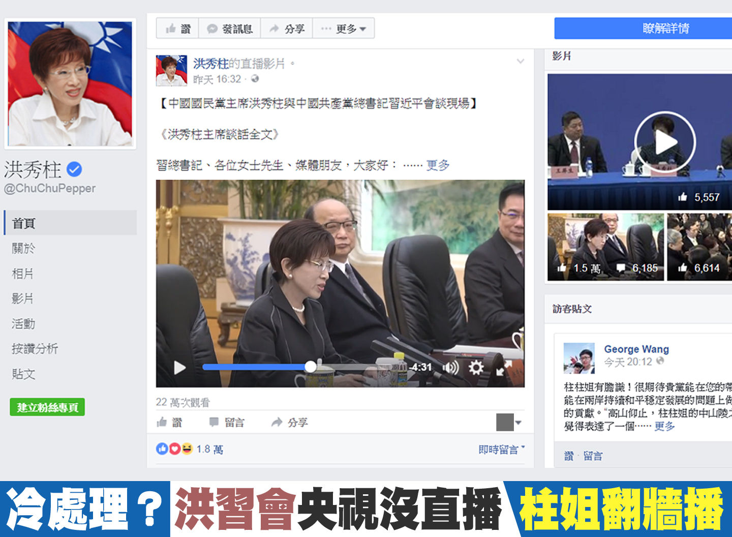 【新唐人亞太台 2016 年 11 月 02 日訊】洪習會1日在北京舉行,儘管中國媒體對此冷處理,現場影像卻透過洪秀柱的臉書「直播」功能,在會後傳播出去。21萬瀏覽人次中,很大一部分是來自中國網友的簡體字留言,也有人抱怨,必須翻牆來台灣,才能得到最新消息。
