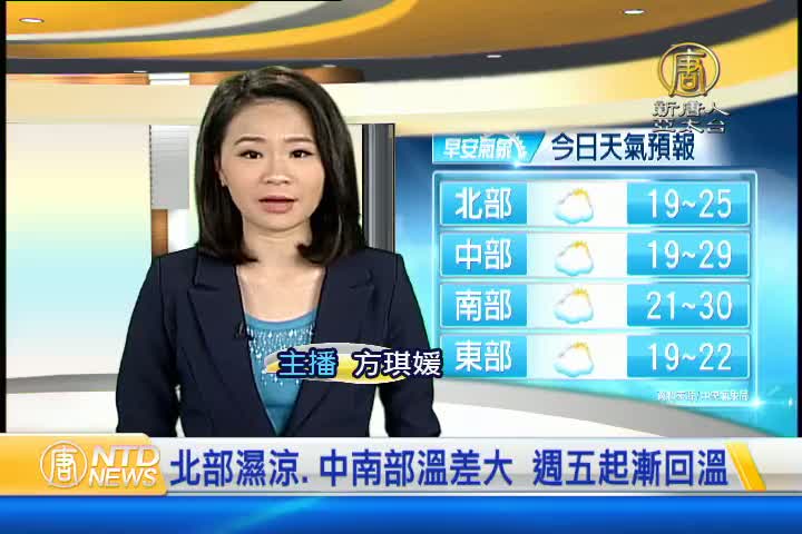 【新唐人亞太台 2016 年 11 月 03 日訊】歡迎您收看11月3日的早安新唐人,我是方琪媛。先來帶您關心今天的天氣情況。觀眾朋友今天清晨可能都感受到強烈低溫,今天清晨,台中以北及宜蘭只有18到20度, 今天 東北季風持續影響,北台灣濕冷 白天高溫約在23到25度,而中南部日夜溫差較大。預計星期五開始,氣溫將會逐日回升,北部高溫甚至可能會提升到30度。帶您一起來看到國際媒體重要訊息。