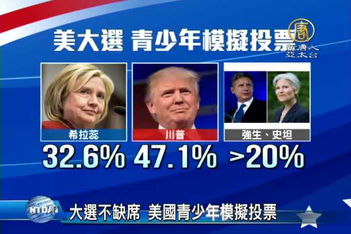 【新唐人亞太台 2016 年 11 月 03 日訊】美國大選,不只全球關注,來自50個州,超過10萬名年齡介於13到19歲的青少年,舉辦了模擬投票和統計競賽。