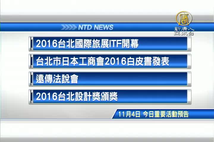 【新唐人亞太台 2016 年 11 月 04 日訊】接著看到,今天,11月4日,星期五,有哪些重要活動。首先是,2016台北國際旅展開幕。以及,台北市日本工商會2016白皮書發表。遠傳法說會 。最後是,2016台北設計獎頒獎。