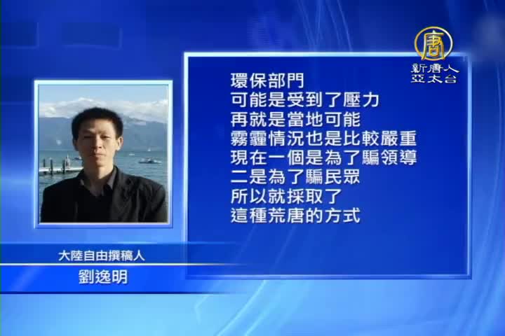 大陸自由撰稿人劉逸明:「環保部門可能是受到壓力。再就是當地可能霧霾情況也是比較嚴重。現在一個是為騙領導。二是為騙民眾,這就採取這荒唐的方式。」
