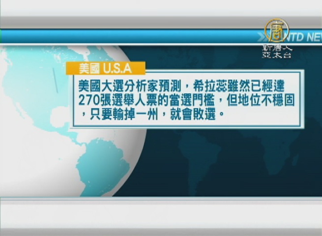 美國大選分析家預測,希拉蕊雖然已經達270張選舉人票的當選門檻,但地位不穩固,只要輸掉一州,就會敗選。
