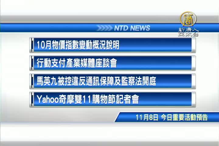 【新唐人亞太台 2016 年 11 月 08 日訊】接著看到,今天,11月8日,星期二,有哪些重要活動。首先是,主計總處發布10月物價指數變動概況說明。接著是,三星電子舉辦行動支付產業媒體座談會;前總統馬英九被控違反通訊保障及監察法等開庭。最後是,Yahoo奇摩雙11購物節記者會。