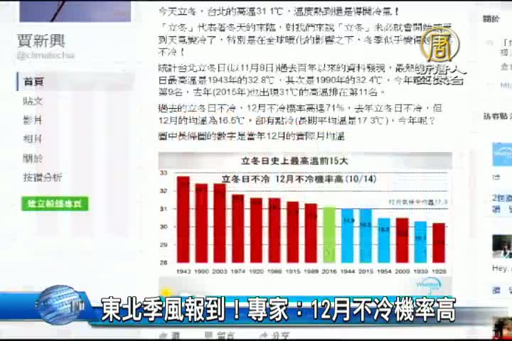 【新唐人亞太台 2016 年 11 月 08 日訊】隨著鋒面和東北季風增強,北臺灣今天中午起,高溫下降了 3~4度,也有明顯的雨勢,預估週六才會恢復晴朗穩定。另外,昨天節氣是「立冬」,但全台高溫在 30度上下,對此,天氣風險管理公司總監賈新興在臉書指出,受全球暖化的影響,冬季似乎變得越來越不冷,根據統計,往年立冬日天氣不冷時,12月不冷的機率,將高達71%。