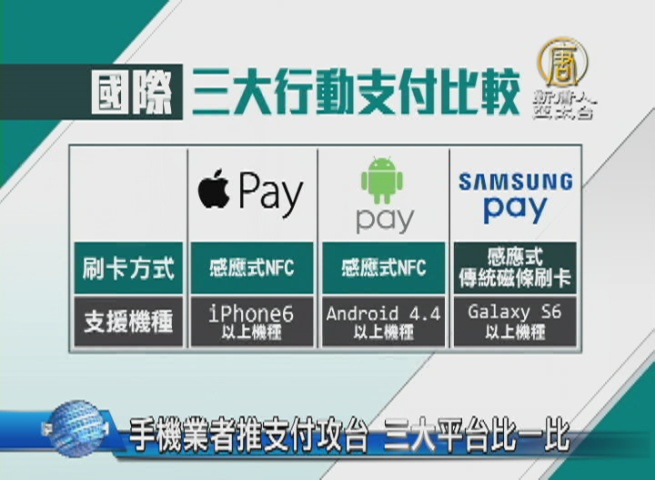 【新唐人亞太台 2016 年 11 月 08 日訊】台灣行動支付市場大戰,包括Apple Pay、Android Pay、Samsung Pay都在準備進軍台灣市場,台灣三星今天宣布,與七大銀行合作,預計明年將正式推出Samsung Pay。