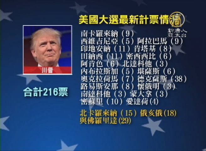 【新唐人亞太台 2016 年 11 月 09 日訊】來關心2016美國大選 目前最新的開票結果,共和黨總統候選人川普,目前是以 216張選舉人票,領先對手 民主黨總統候選人希拉蕊的 209 票。川普目前一共拿下了22個州, 而希拉蕊,目前則是拿下 16個州1個特區,剛剛又新增加了 華盛頓 與 俄勒岡 兩個州。