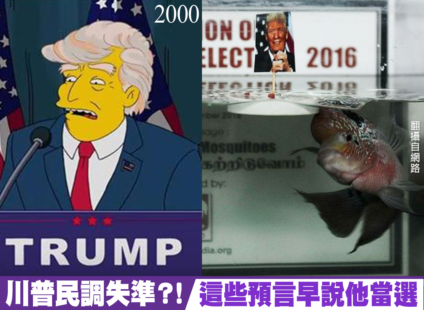 川普高票入主白宮,跌破許多外媒民調,不過選前有多項另類預測都說川普當選,包括印度清奈魚「羌納迦三世」和中國猴「預測帝」,連俄羅斯北極熊都咬有川普照片的南瓜,另外,16年前《辛普森家庭》「預言」川普當總統;連藝人蔡依林與陶?歌曲中,提到DT in the house也都被網友腦補成Donald Trump in the white house。