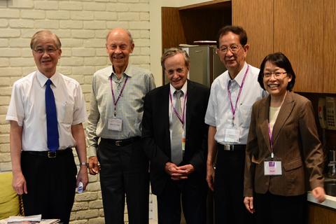 (右起)中研院副院長周美吟、中研院前院長李遠哲、約翰.波拉尼博士、達德利.赫施巴赫博士、臺大校長楊泮池(中研院提供)