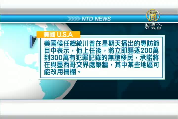 美國候任總統川普在星期天播出的專訪節目中表示,他上任後,將立即驅逐200萬到300萬有犯罪記錄的無證移民,承諾將在與墨西哥交界處築牆,其中某些地區可能改用柵欄。