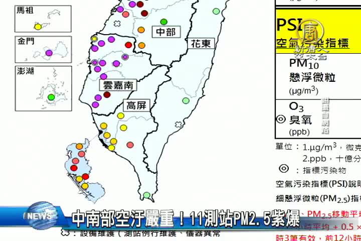 【新唐人亞太台 2016 年 11 月 14 日訊】歡迎回來,來關心,受到大氣擴散不佳影響,台中上午8點空氣品質狀況差,全市16個監測站有近半、7站非常不良「紫爆」,4站紅色等級,而台南市今天上午PM2.5也出現紫爆!在凌晨2點時,還一度破百,空污十分嚴重。統計下來,中南部共有11個測站PM2.5達到紫爆等級。