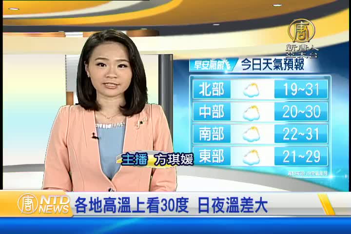【新唐人亞太台 2016 年 11 月 18 日訊】歡迎您收看11月18日的早安新唐人,我是方琪媛。先來帶您關心今天的天氣情況。秋老虎發威,今天全台各地都是多雲到晴的好天氣,各地高溫上看30度,這樣的天氣,將持續到周末,不過,提醒觀眾朋友,日夜溫差大約有10℃,東半部地區和北部山區,也要留心有零星降雨的機率。帶您一起來看到國際媒體重要訊息。