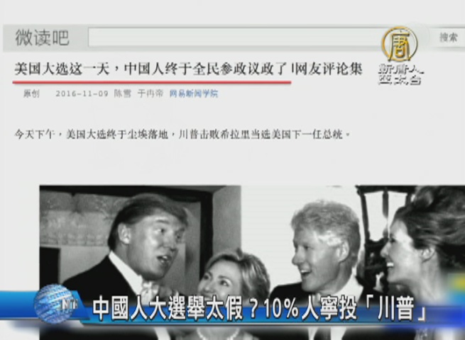 中國人大選舉前,美國大選剛剛結束。大陸官方媒體,大量報導美國大選的負面消息,並放開網民討論。在新浪微博,「美國大選」話題的閱讀量,11月11號突破15億,跟貼超過73.8萬條。