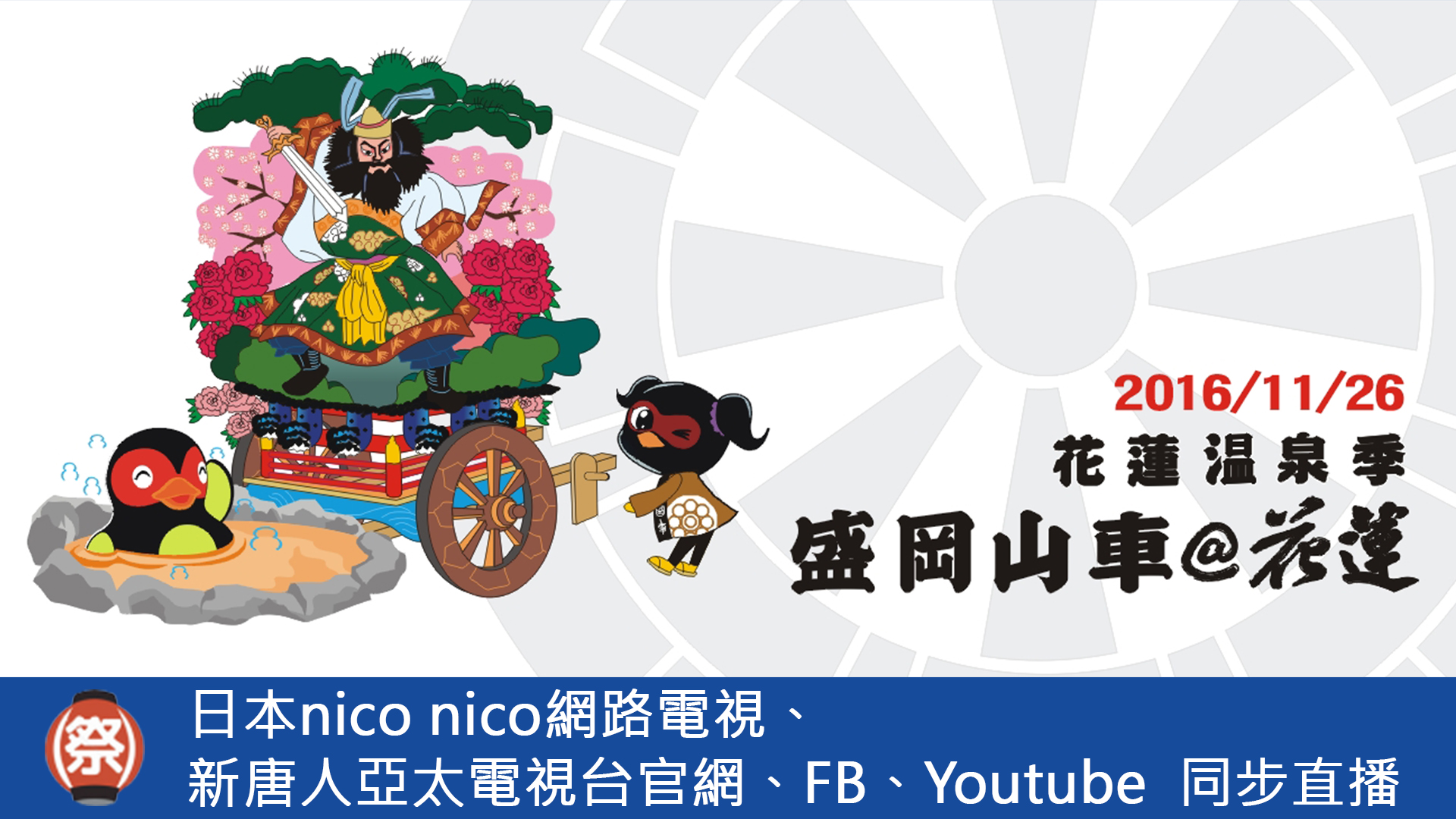 暌違9年第3度來到花蓮,擁有300年歷史的日本岩手縣盛岡市傳統祭典山車,即將在11月26日再現花蓮街頭,並為2016花蓮溫泉季掀起高潮。新唐人亞太電視台屆時將全程透過官網、FB、youtube進行直播,並與日本網路電視NICO NICO頻道合作同步直播,讓台日都能即時看到踩街遊行的盛況,敬請準時鎖定本直播頁或新唐人亞太台粉絲團進行觀賞。