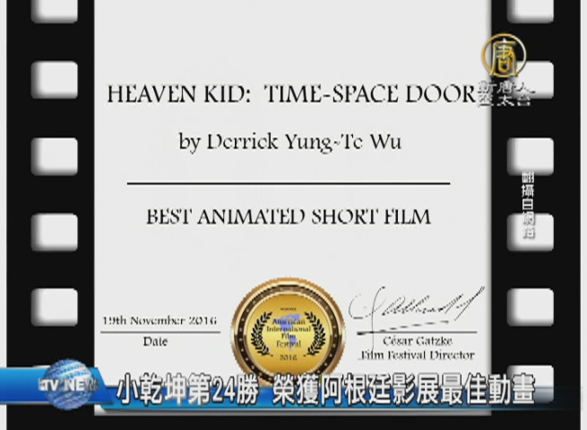 【新唐人亞太台 2016 年 11 月 22 日訊】臺灣動畫《天庭小子-小乾坤》(HeavenKid)再傳捷報!摘下阿根廷美洲國際影展「最佳動畫短片」(American International Film Festival)。《小乾坤》脫離制式的課堂教學方式,用創新的戲劇手法,將艱深的中華經典《弟子規》轉換成趣味的現代生活故事,讓孩子從娛樂中學習「道德重於財富學識」的核心價值。