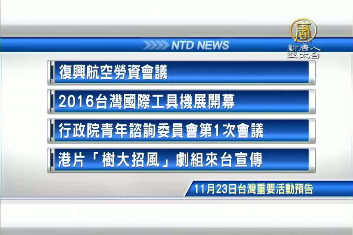 【新唐人亞太台 2016 年 11 月 23 日訊】接著看到,今天,11月23日,星期三,有哪些重要活動。首先是,上午8點半,復興航空舉行勞資會議;另外,2016台灣國際工具機展開幕;還有,行政院青年諮詢委員會第1次會議,以及。入圍本屆金馬獎最佳劇情片的香港電影「樹大招風」劇組來台宣傳。
