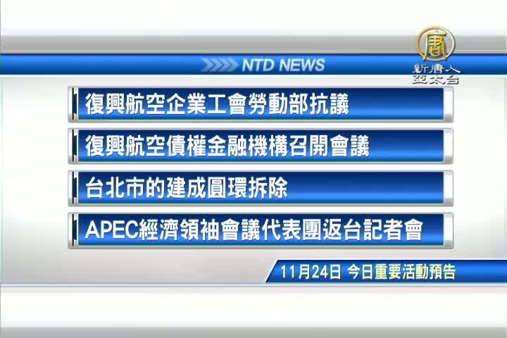 【新唐人亞太台 2016 年 11 月 24 日訊】接著看到,今天,11月24日,星期四,有哪些重要活動。首先是,復興航空企業工會成員前往勞動部抗議;另外,復興航空債權金融機構銀行團將召開會議商討因應;還有,台北市的建成圓環展開拆除;以及,APEC經濟領袖會議代表團返台記者會。
