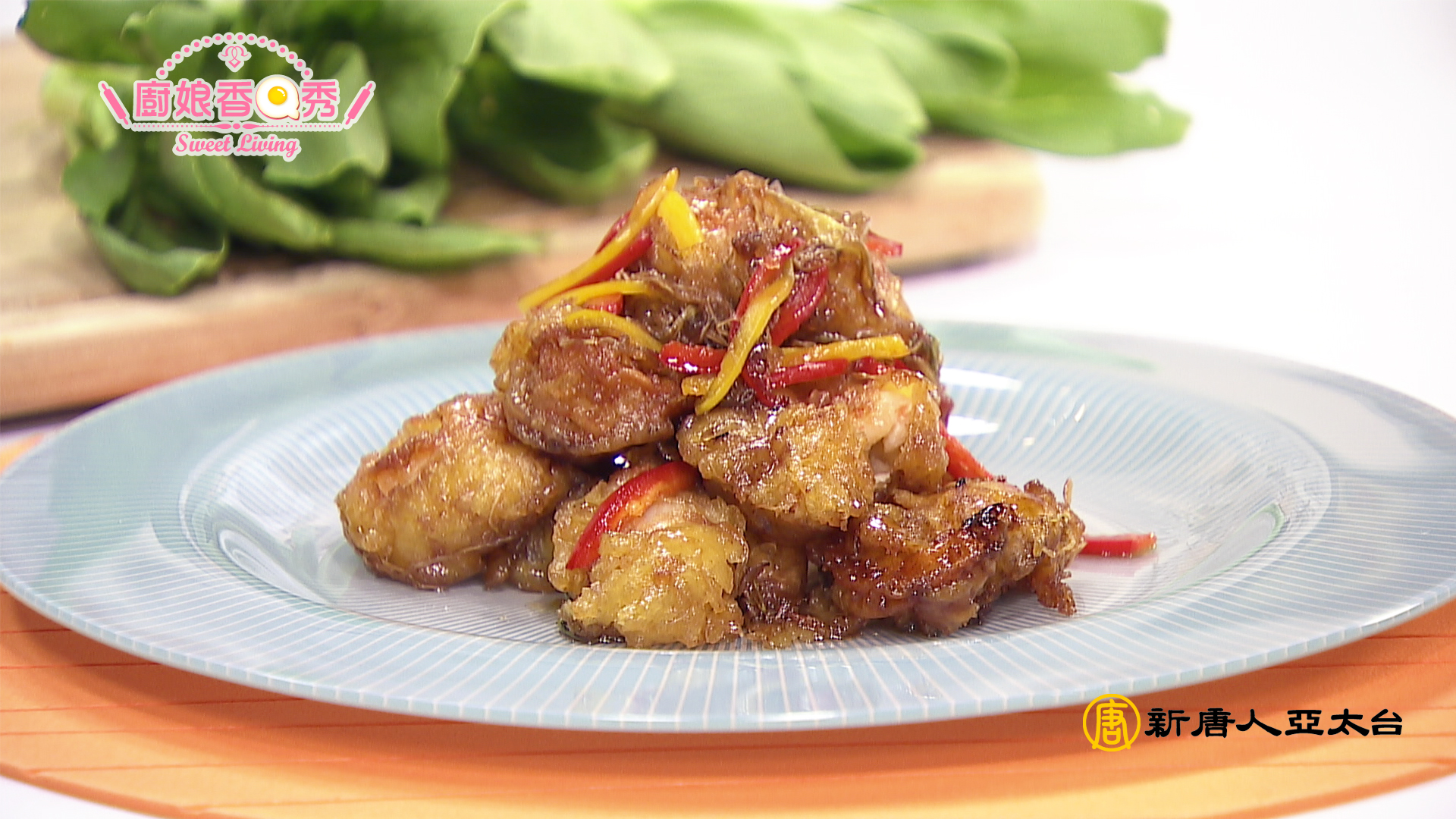4. 鍋子內留少許油,將薑、蔥絲爆香,加入糖、醋等調味料,再加少許水溶化糖等醬汁,另再加少許鹽巴提味,再倒入剛炸好的蝦子一起翻炒,再放上紅黃甜椒,起鍋前再加一點醋嗆蝦。完成擺盤。