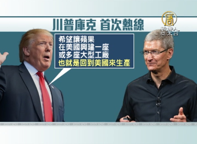 【新唐人亞太台 2016 年 11 月 27 日訊】關鍵時刻,帶您迅速掌握潮流趨勢,歡迎您收看財經趨勢4.0,我是沈唯同。首先帶您聚焦,美國總統當選人川普的新政,給全球產業,同時帶來衝擊與機會,其中一項最受關注的,就是美國製造,川普最新透露,蘋果執行長庫克和微軟創辦人比爾蓋茲,已經打電話恭喜他當選總統,他也向庫克提出蘋果要在美國生產的要求,不過,庫克只有回應,我知道了,並沒有多做表示。