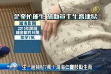 2015-01-29 21:50:07台灣面臨少子化危機,2014年總生育率 全球最後一名,為了鼓勵員工生育,企業也幫忙「催生」,鴻海集團28日宣布,員工生育每胎至少補助7萬,仁寶集團也早在4年前,就有6萬6的補助,讓女性員工,想要再生一個。